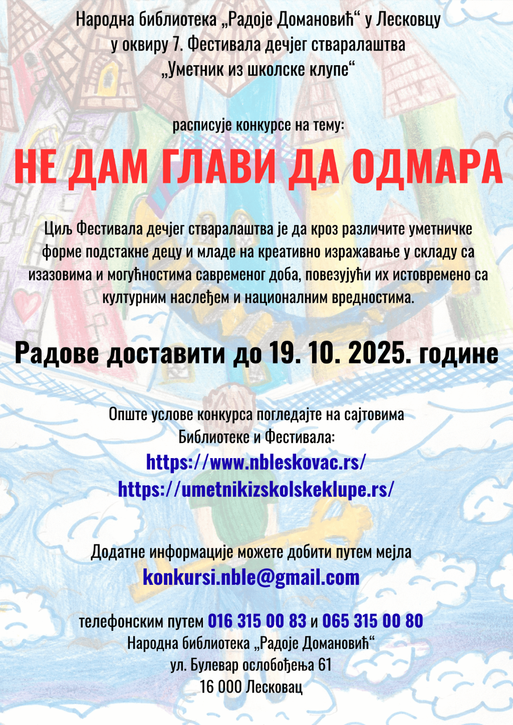 Пропозиције конкурса у оквиру 7. Фестивала дечјег стваралаштва „Уметник из школске клупе“Народна библиотека „Радоје Домановић“ у Лесковцу, у оквиру 7. Фестивала дечјегстваралаштва „Уметник из школске